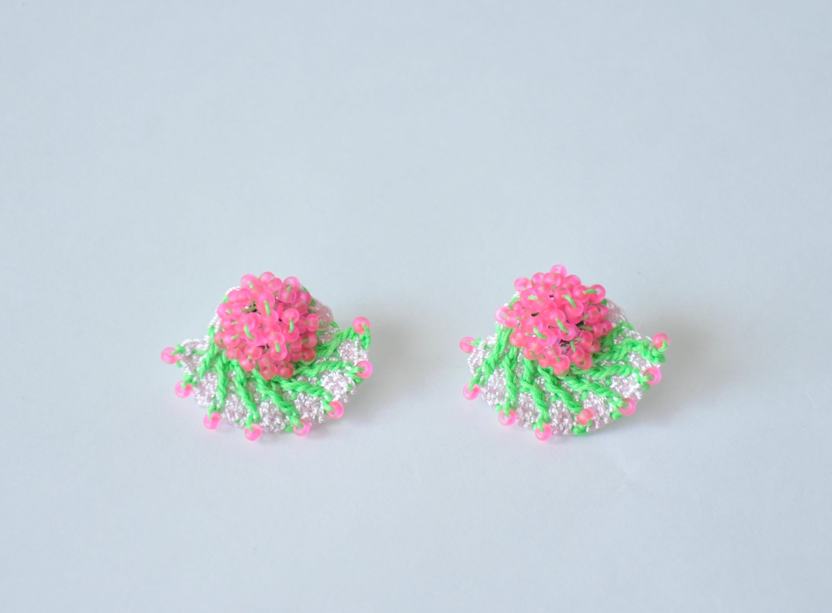 ネオンピンクのビーズに光沢のある薄ピンクのオヤ糸ネオングリーンのオヤ糸はマットのオヤ糸を使用しています。