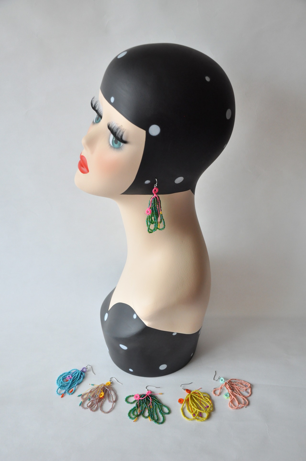 チェコビーズをフープ状に編み上げて、長さの違うフリンジピアスに仕上げました。